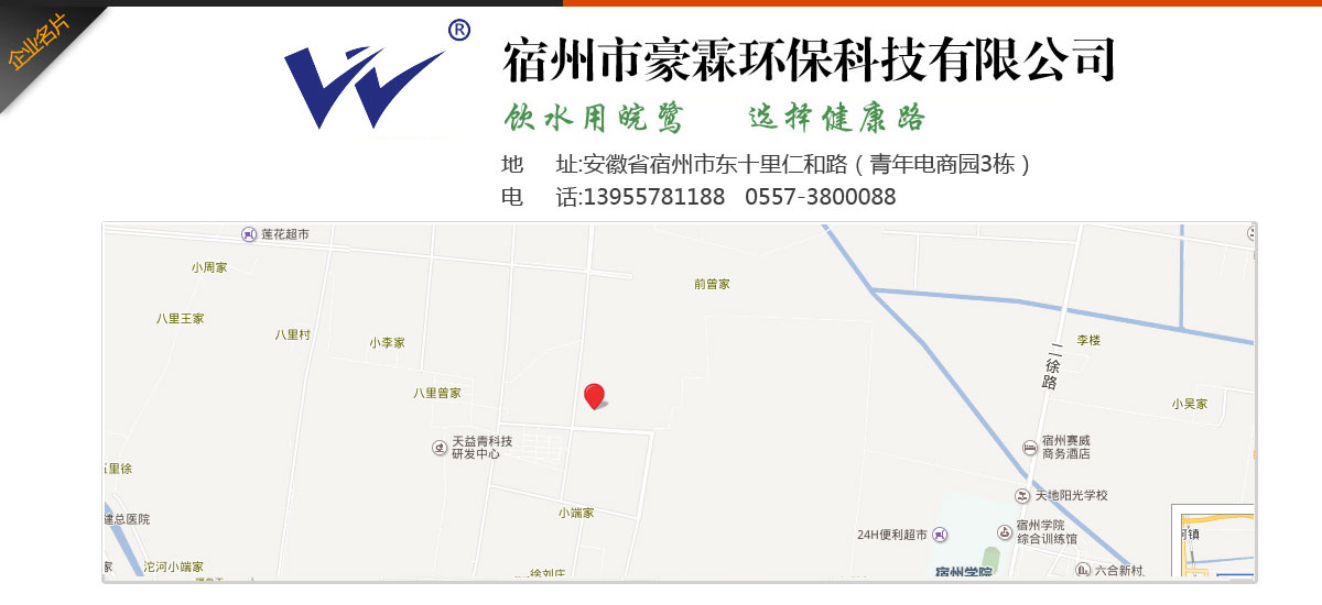 - 宿州市豪霖環(huán)??萍加邢薰緦I(yè)致力于水處理產(chǎn)品和系統(tǒng)水處理工程,集產(chǎn)品的開發(fā)與銷售、工程配套與安裝、技術(shù)咨詢與服務(wù)于一體的新型環(huán)保企業(yè)。主營產(chǎn)品:家用、商用純水機(jī)系列,能量活水機(jī)系列,家用、中央用凈水器系列,管線機(jī),泵、膜系列,各種零配件、水處理耗材等配套產(chǎn)品系列,循環(huán)冷卻水處理系統(tǒng),鍋爐軟化水處理系統(tǒng),海水、苦咸水淡化、污水處理系統(tǒng),軟化及過濾裝備,紫外線及臭氧消毒設(shè)備等全部產(chǎn)品。